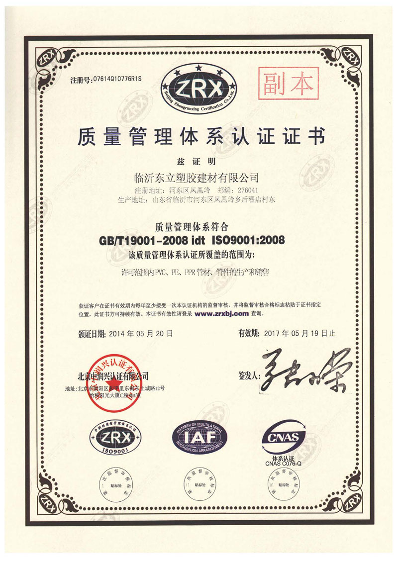 質(zhì)量管理體系認證證書
